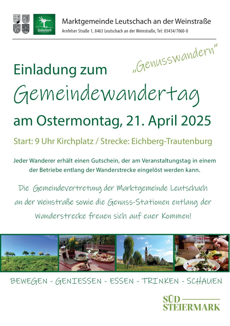Start: Rathaus Leutschach – Hauptplatz, Richtung Eichberg (Friedhof vorbei), nach Schusterbauer links Wanderweg – Richtung Reiterer/Kollersimmerl – Trautenburg Stub’n – Weinkulturgarten – Weingut und BS Kollerhof-Lieleg – BS Oswald/Spitzlgodi – BS Wutti – über Pinnitsch Hopfenacker – F. J. Plasch-Siedlung nach Leutschach.