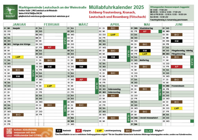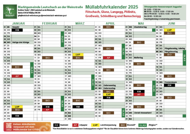 Da die Firma Poscharnegg schon sehr früh mit der Müllabfuhr beginnt, werden Sie ersucht die Mülltonnen und Säcke bereits am Vorabend rauszustellen.